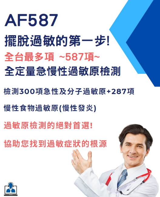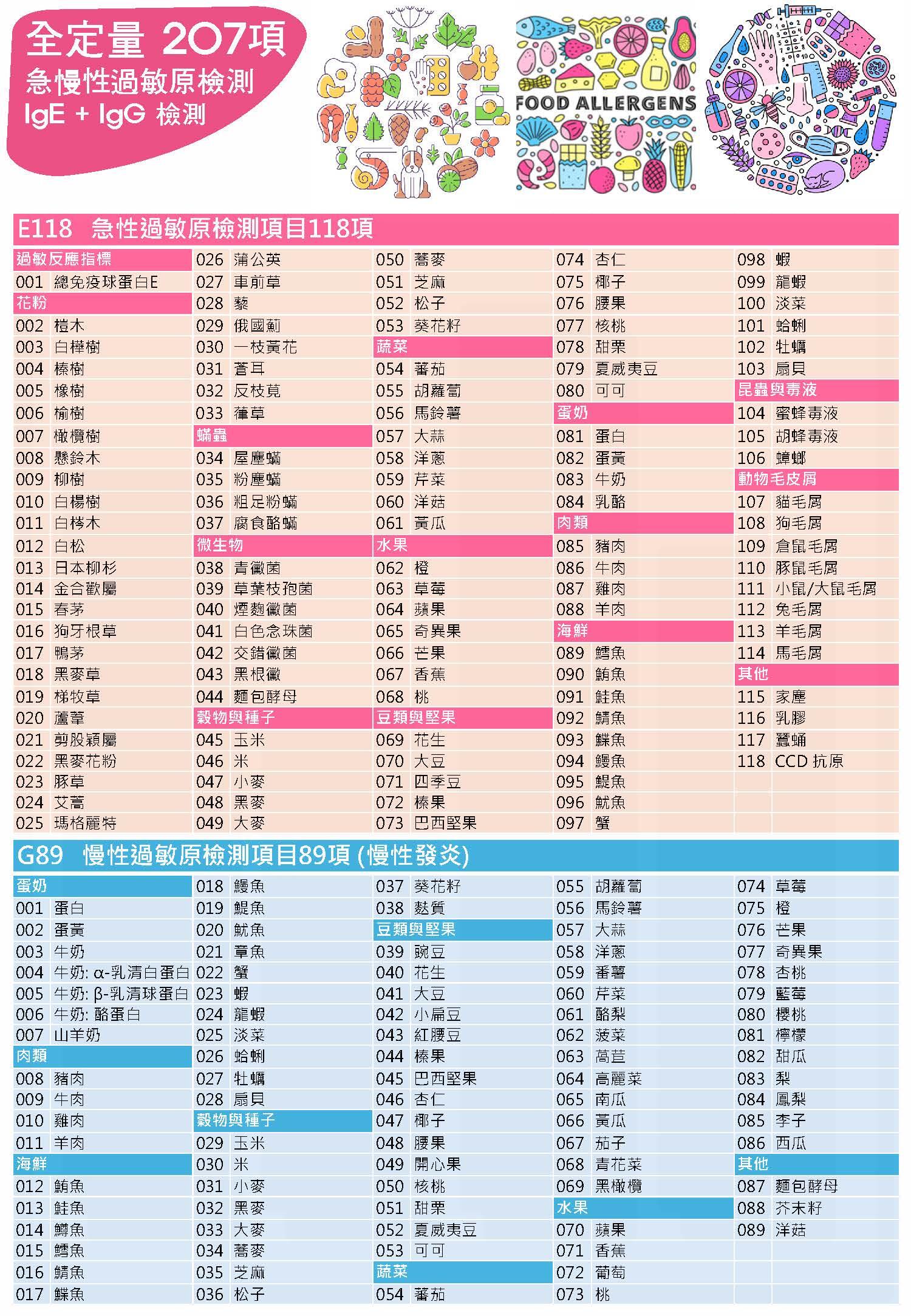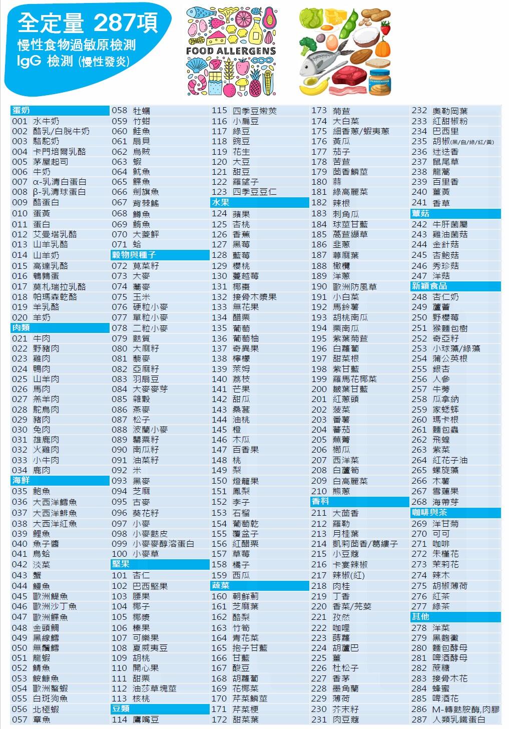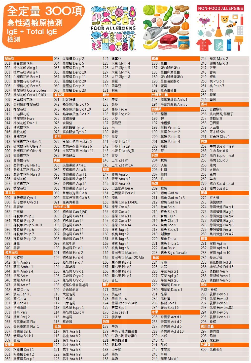| 過敏原檢測 | 急慢性過敏原、食物類、環境、重金屬、藥物、塑化劑、化妝品等過敏原檢測 | 找出過敏源,改善生活品質。 |